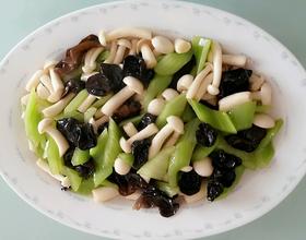 - 8. 锅里放西芹、木耳、白玉菇翻炒,然后倒入调好的碗汁,翻炒后放盐、糖调味。