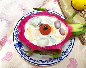 把酸奶水果捞倒入火龙果皮里,漂亮吧!