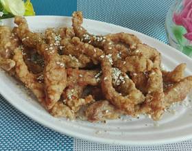 肉条下锅定型后把火调大一点,并用筷子随时翻动,防止肉条炸糊,再就是炸完肉条的油晾凉后装入油壶内,炒菜时先用完,下次再炸时还是用新油,这就是在家做的好处,用过一次的油做菜不会影响口感,每次用新油炸制的食物也相对比较安全健康。