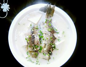 锅内在放入开水,大火煮至,加入姜片,葱段,煮至奶白加入豆腐,盐,胡椒再煮五分钟,装入汤盆,撒上葱花即成