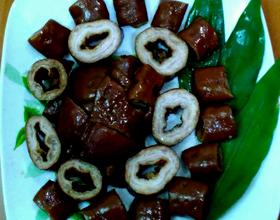 - 4. 将卤水烧开,放入大肠,小火煮5分钟,关火浸30分钟