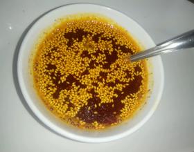- 5. 把油都倒进辣面里不停搅动。现在就可以闻到一股股香味扑鼻而来,最后等油稍晾一会儿,拿筷子沾点蜂蜜放入辣椒油搅匀即入。辣椒油里放蜂蜜,可以使其味绵软香滑,也可以减少一些些辛辣味。