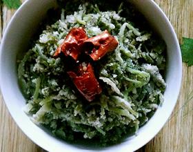 把蒸熟的香菜拌面菜放入盆里 放入盐 花椒粉 鸡粉 干红辣椒切段 锅里加适量的油浇到放好的调味品上 搅拌均匀即可 装盘