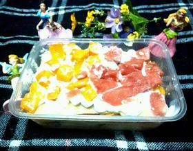 然后拿出盒子铺一层千层饼皮,挤一层奶油放上水果再铺一层饼皮,挤上奶油放水果,如此铺个4层,最上面再挤上奶油放上水果,然后冰箱冷藏再吃非常好吃。