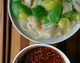 展开,用手拉住面条两端,上下抖动,将面条抻长抻薄