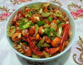 再放龙虾一起炒放盐味精加点水焖下。焖下才更入味哦