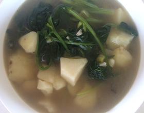 加入水,没过土豆,炖一会,直至土豆快熟,这时加入菠菜,同时放盐、鸡精、少许生抽、十三香。