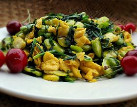 蚕豆米洗净,韭菜洗净切小段,鸡蛋打蛋液