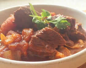 再加水(盖过牛腩和番茄),烧开后转小火炖1小时,出锅前加糖调味