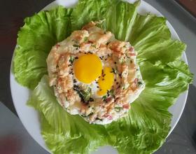 将蛋黄倒入蛋清坑中,再入烤箱继续烤至微金黄。