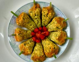 - 5. 把瓜花逐朵清洗干净,滴出多余的水,把拌好的馅料塞进瓜花里面