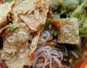 感觉粉软了就可以捞起来放碗里,然后把青菜,配菜一起放到盛有粉的碗里