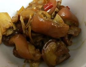 锅里烧开水把炒过的猪蹄放进去,水少点,不要淹过猪蹄,然后下酱油煮到剩少量的汤汁就可以起锅了
