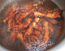 煮好的鸡爪全部放进这汁里上一下色