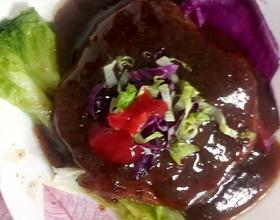 放入黑胡椒酱,撒上紫甘蓝生菜丝,放入一勺番茄酱装饰。