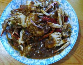 把锅放上油6~7层热时放入葱姜炒出香味,下入螃蟹炒一会再放入豆瓣酱,放入热水用中火炖一下