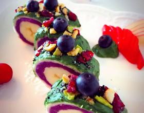 - 1. 把面包边去掉 用擀面杖把面包压扁 涂上蒸熟的紫薯 如果紫薯太干 里面可以加点蜂蜜水或者蓝莓酱 口感更加 放上香蕉 慢慢卷起来