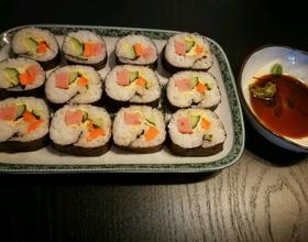 - 4. 米饭微凉就可以卷了。先均匀的铺上一层米饭稍微少铺点,我这个稍微铺的有点儿多,最外边那留一个3/4的一个边儿,然后再把这个蔬菜一条一条的摆好,最后挤上的沙拉酱,就可以卷了。
