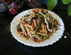 快炒,速度快,用颠勺的方式混匀快平底锅轻,颠勺容易些蔬菜按照易熟时间安排入锅顺序最后盐尽量撒在其它蔬菜上,因为肉丝和茄丝提前腌制过,都含有盐份