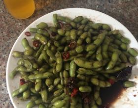 加入油、干辣椒、盐、白糖、生抽、醋,在锅里烧热,拌好毛豆。