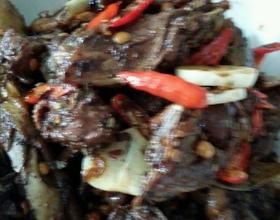 加入鸭肉继续炸至金黄色加水煮十分钟致水干放炒好的黄豆,盐,料酒炒五分钟,放酱油上色,加辣椒,油泼辣子,鸭血,大蒜,翻炒放入花椒粉生抽起锅