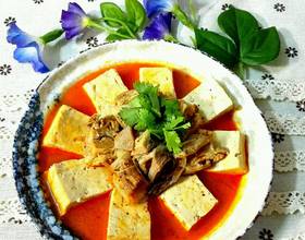 煮过羊肉的汤烧开,放入羊肉,豆腐,辣椒油小火煮十五左右,起锅前加入鸡精