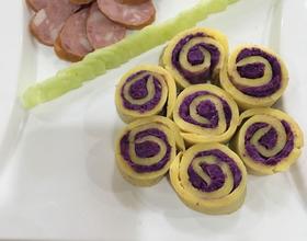 面粉,玉米面粉,牛奶鸡蛋,放在一起,这个时间把紫薯去皮,放入盘中,上面盖上保鲜膜放入微波炉里加热5分钟。