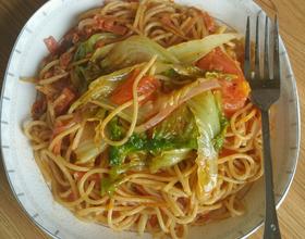加入意面,西红柿和备好的调料颠炒均匀,入味,最后加入生菜,