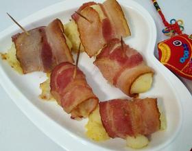 - 10. 用培根卷上土豆球,用牙签固定。放入烤盘(提前刷一层橄榄油)中。