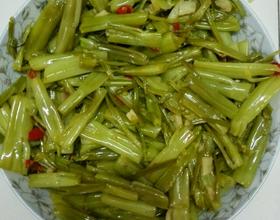 锅里放油炒热,放入小米椒,大蒜,然后倒入空心菜梗,吵得半熟的时候加入醋,快炒好的再放盐