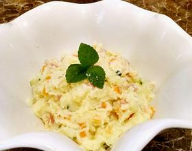 趁热放进沙拉酱,盐,糖,胡椒粉,组8后放入蔬菜丁拌匀即可