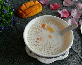 - 6. 晾凉的椰奶里加入Q弹的西米和芒果粒,尽情享用吧。