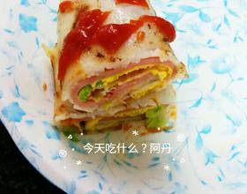 对折卷好,切半,小孩喜欢番茄酱,加一点