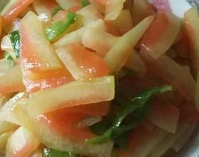 放油,油热后放入花椒,葱,姜,辣椒,炒出香味,然后放入西瓜皮继续翻炒。