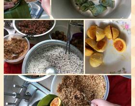 现在就可以包了,下面先放一小层,用酱油拌好的糯米,然后中间夹入一两块小肉,然后再放入半个,鸭蛋黄,最后再,把它包起来。