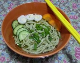 煮好面,碗里先放葱、生抽及山茶油用热汤浇开,盛面,再放入一些自己爱吃的配菜。