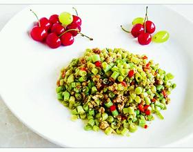 青·红椒切小丁,姜蒜切末,豆角切丁