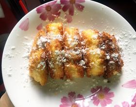 馒头片一面成金黄色就可以翻过来继续煎另一面成金黄色后捞出沥干油分,撒上糖粉即可……