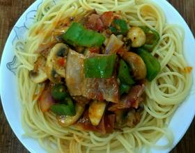 锅放少量油,将蒜末、茄汁煸炒,加入青椒、洋葱、口蘑、培根继续翻炒,盐、糖、胡椒粉调味,少加些水稍刻出锅。