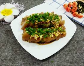 准备酱汁:蒜切末,小半勺味精,2小勺酱油,2小勺蒸鱼豉油,3小勺醋,4滴香油,搅拌均匀