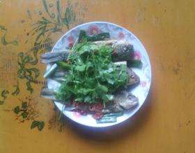 锅里熬油,淋在鱼身上,放入香菜既可