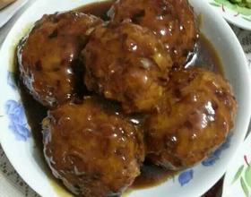 - 1. 香菇、冬笋、葱、姜、荸荠、油条(或面包屑)切小丁儿,为了健康可以选择鸡肉、鱼肉、牛肉切丁儿剁成泥,将所有材料混合放料酒、少许生抽、少许盐、胡椒、鸡粉腌制半小时,倒入少许淀粉和蛋清,捏成适当大小,小火儿把油烧至八成热,放入丸子炸至金黄出锅,放入蒸锅蒸10分钟(待内部全熟),放凉后再次过油,倒出多余的油放水煮5分钟,让丸子吸足水份(尤其牛肉、其次鸡肉最容易肉干),捞出做汁儿,放足够生抽、耗油汁儿、水淀粉(都要一次放够)搅匀,最后浇汁儿齐活