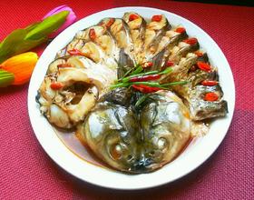 把鱼头鱼尾鱼鳍切掉,鱼头从中间劈开,鱼头上面不用劈断,在鱼背切一厘米的段,鱼肚部分不要切断。