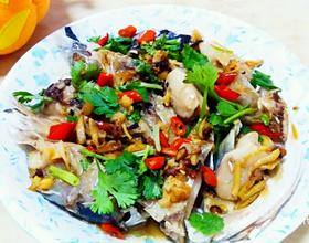 - 2. 大头鱼头放入1勺蒸鱼鼓油,1勺料酒,1勺香油少许精盐腌制10分钟,再放上备好的几片生姜。