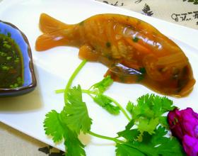 脱模后一条话灵活现的皮冻鲤鱼完成了。装盘前,用刀把鱼切成片,但不破坏想体形状,再配上一份由生抽、陈醋、香油丶味精和香葱调成的浇计。好了,可以和大家一起分享了。