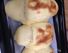- 5. 时间过半发现面包表皮出现黄斑,怕受热不均立马剪了一截锡纸盖上面包,继续烤。烤完后拿出来放冷(不烫手的时候应该立马移出烤盘放在冷烤架上自然冷却低)。