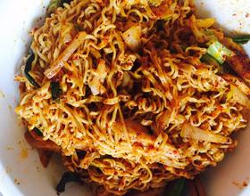 放油,然后放葱姜蒜,辣椒面。在放火腿肠。放方便面。在然后放其他的菜。放入盐就可以了,
