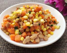 待肉丁七分熟时加入胡萝卜玉米翻炒至熟