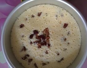 加入适量的葡萄干儿,核桃枣干,翻拌均匀。倒入磨具把气泡震出来,这是8寸蛋糕的模具哦再在上面撒一些葡萄干。