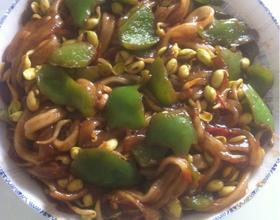 将准备好的黄豆芽倒入锅里翻炒,接着倒入青椒翻炒均匀